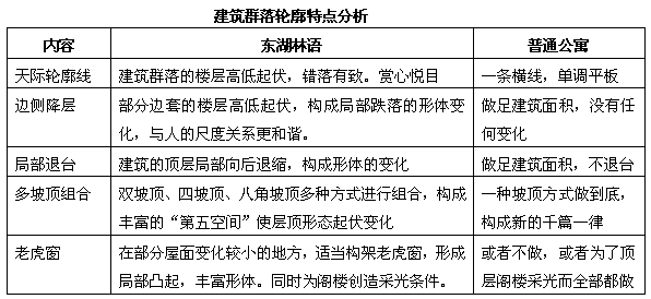 对建筑群落轮廓的研究如同做雕塑一般,寻求建筑的美感,建筑轮廓由天际线、屋顶、边侧墙体、窗等构成,综合运用的好坏决定了建筑轮廓的丰富与美观程度。