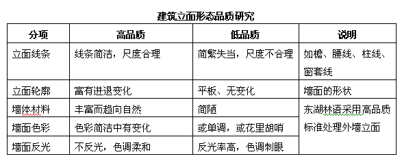 建筑立面形态分为线条、轮廓、墙体材料、墙面色彩、墙面反光五方面,高品质的建筑立面处理给人一种自然、柔和的感受。