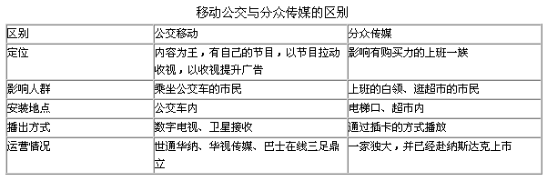 但是,把移动公交电视比作移动的分众传媒似乎并不恰当。因为,相对于分众传媒竖在写字楼电梯口或者超市通道中那块永远播放广告的液晶屏,公交移动传媒给自己的“移动电视”下的定位远远超过于此。因为他们在公交车上的液晶屏并不仅仅是个广告的发布平台,在某种意义上它更多地是一个“电视台”,是一个节目和内容的“通路”,“内容为王”成为了移动公交电视的杀手级绝招,也使得其与分众传媒区别开来。世通华纳董事长鄢礼华在谈到公交移动电视与分众传媒的区别时说,“我和江南春不一样,我们是一个完整的运营商,包括终端的维护,节目内容的制作,广告的发布,同时拥有整个移动电视的经营平台,一个有自己节目的大众媒体。而江南春是单纯地卖广告。”