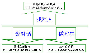 即“找对人”、“说对话”、“做对事”。找对人,是指在传播中有针对性地向各个阶段的关键人传播,并找到有效的品牌传播的关键接触点;说对话,是指传播主题要精准,用一剑封喉的力度创造传播内容;做对事,是指通过正确的落实节省品牌成本。