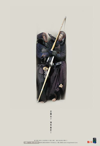 創意概念:空間太小?到外面打!不同於傳統的平面廣告與電視廣告,戶外廣告可以和環境結合,可以和消費者互動,型式更是不拘,有更多可以讓創意人揮灑的空間,所以演出各種在狹小空間裡的競技,要創意人走出來,到戶外廣告的領域裡,一決高下。龍璽2006戶外廣告徵選龍璽 / 戶外廣告-劍道篇 / 拳擊篇聯廣股份有限公司企業形象-系列创意总监: 張怡琪 / 陳靚 文案: 盧建彰 美术指导: 曾昱傑 / 黃庭柏