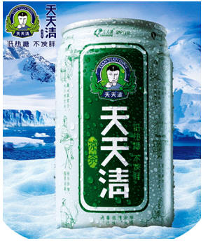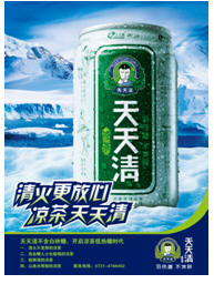 ‘差异设计’打造形象:确定了产品差异化卖点,高度对产品进行了重新的VI设计和包装。在王老吉一枝独秀的局面下,现在市场上的凉茶品牌,多采用跟随策略,不但产品诉求与王老吉相似,甚至连包装也是大同小异,以大面积的红黑黄色彩搭配。为了与其他凉茶品牌形象区隔,天天清凉茶采用青、白色作为主色调,表现出产品的淡雅素静。