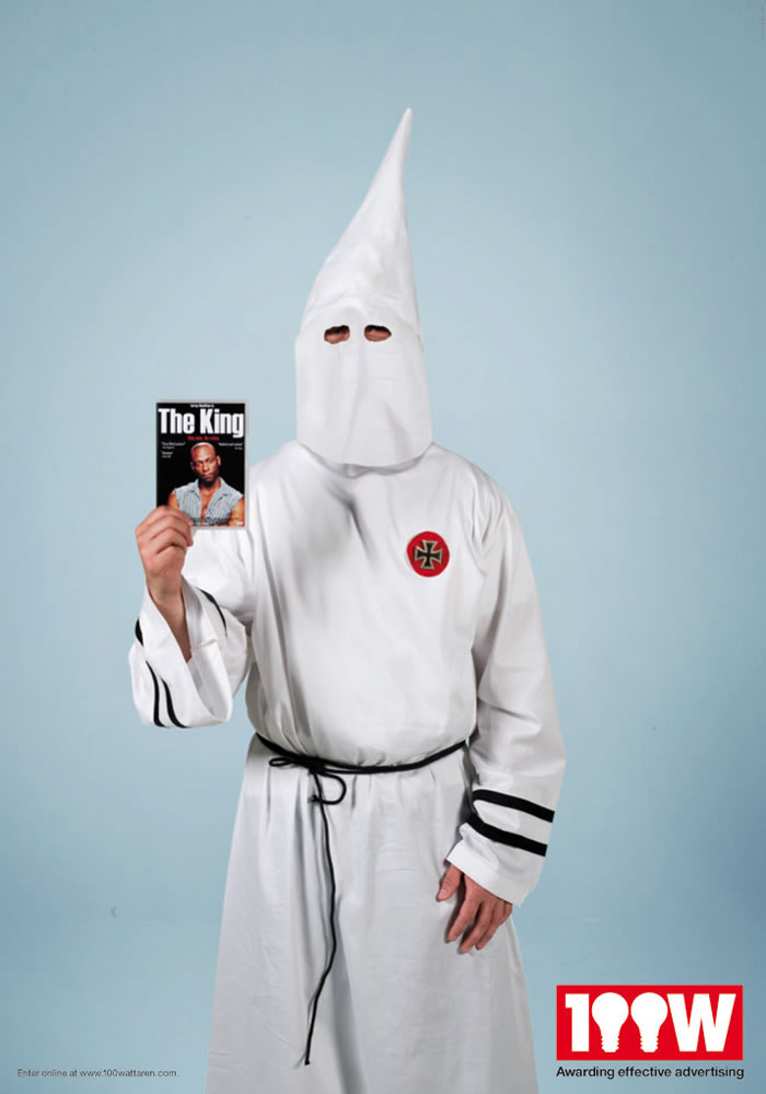 “100瓦奖项,授予那些最有效的广告。”100瓦特.com的网站广告。四幅画面都有一个共同的特征,就是把商品卖给最不需要这个商品的人。这个人的打扮,应该是白人激进组织,带有强烈种族主义倾向哪种。所以DVD的“the king”才是一个反面的东西。。