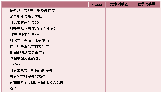 同时用这个表格,对自己竞争对手邀请的美女代言,做一下横向评估,更具有针对性,能够立刻知道自己要请的代言人,会在市场中处在什么地位,是否要请该美女明星作为代言人,是否有利用开发价值,因为本评估表格需要不断优化,您需要的话,可以和笔者联系,获得最新的美女代言量化分析表格,进行有效评估,如果总分值,低于竞争对手30分以上,可以考虑不予考虑,如果和对手分值差距在30分内,可以考虑,听取更多人的意见,尤其是来自消费着和合作伙伴的,如果高于对手30分,应该毫不犹豫,马上行动了。当然不想请美女,或者没钱请怎么办,请关注以后的笔者相关的小文,会有借鉴。