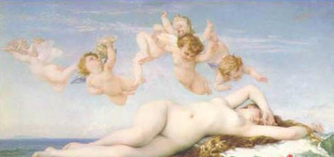 在古罗马神话中,维纳斯是象征着爱与美的女神,在古希腊神话中这位美丽的女神叫做阿芙洛狄忒。她诞生于大海,她名字的含义是“从海水的泡沫里诞生。”对阿芙洛狄特忒的崇拜,明显地表现出群婚制的残余。在奥林匹斯众神中,她被认为是工匠之神赫菲斯托斯的妻子,却有众多的情人,曾经一次次的失节私通。荷马史诗中曾经提到,她常与战神阿瑞斯幽会,她最重要的凡间情人有特洛伊英雄安基塞斯,他们生了罗马人的祖先埃涅阿斯。还有英俊少年阿多尼斯,他在打猎时被咬伤而死。在古代神话传说中,这位通常半身裸露的女神被塑造成一个美丽绝色的女子,用以体现理想的女性美。毫无疑问,在隐秘的内心世界,维纳斯是整个人类的大众情人。