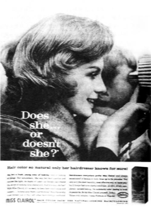 1955年,福康贝丁广告公司为布里斯托尔"迈尔斯公司的“克莱罗”(CLAIROL)染发水做了一个广告。当时在美国,只有大约7%的女性使用染发水,在一般人的观念里的看法是,只有职业女性、女招待或者品行不端的女人才染发。福康贝丁广告公司的文案撰稿人莎莉"波丽科佛却运用性感暗示开创了一个广告新途径,整个广告标题只有五个字,但却极其轰动:“是她……不是她?”(Does she ……or doen‘t she?)广告正文是:“头发的颜色是如此的自然,以致于只有她的理发师才知道真相”。最初这个广告标题受到男性创意指导的怀疑,以致于迟迟不能通过,其理由是广告标题写的太明确了,但莎莉"波丽科佛的女同事们却极力支持这个广告标题,因为只有她们才真正明白这个标题的意图:即使这个女人的亲密朋友也猜不出她染过头发了。广告最后推出了,迈尔斯公司的“克莱罗”染发水销售狂增,六年后销售额增加了6倍,创造了增长413%的奇迹,而在美国调查有接近一半的女性承认自己用过染发产品。但就是这个广告当时曾被认为“太具有挑逗性。”刊登这个广告的《生活》杂志,也曾经因为“广告有一些猥亵的内涵”而拒绝刊登“克莱罗”(CLAIROL)的广告。但不论怎么说,这种性感广告销售模式却创造出了辉煌的业绩。