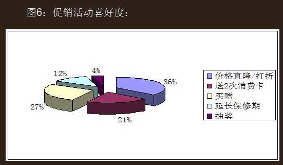 调查数据显示:价格打折、送赠品、送二次消费卡位居消费者喜爱的促销活动前三位,占比分别为36%、27%、21%;价格位置首位,然而价格的因素一般是很难通过促销让消费者获得满意的,加之价格受厂家指导价格规范、零售商盈利压力的诸多影响,促销空调便有一定的限制性,业界竞争趋理性化,价格促销多半采用隐蔽的方式,“送电费”、“送二次消费的现金卡”等;“促销战”体现最多的便“赠品”的拼杀;“买赠”越来越成为最核心的促销活动;