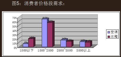 上半年空调的件均价为3180元,较去年同期上升了9%,冰箱的件均价为2465元,较去年同期增长6%。1500~2500元价位段的冰箱、空调均居主流地位,消费者在此价位段的需求分别为57%和65%;