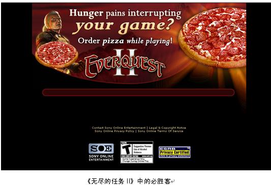 一方面,对某些类型的商品而言,通过和电子商务的结合,实现了产品展示在线、资金流在线、物流配送在线,特别是受众从接受广告到完成购买行为的整个在线过程,都可涵盖在网络游戏服务当中。《大唐风云》有一款能为玩家增加能量的食物:绿盛QQ能量枣,而玩家在游戏中的虚拟商店中,通过信用卡付款或者货到付款的方式下单,就可以买到真实的绿盛QQ能量枣,并享受专门的配送服务。在索尼Everquest II游戏中,在不中断游戏的情况下,键入“比萨”一词,玩家便可进入必胜客的网站,订购比萨饼外卖。这种电子商务模型,只能是作为大的游戏背景下的一个支流,而很难出现电子商务为主,而游戏为辅的模型。