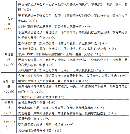 (5)不能单凭销量作为衡量导购员的标准。 除按单台销量提成以外,还应拿出一定数额做外考核工资,考核项目可参照下表: