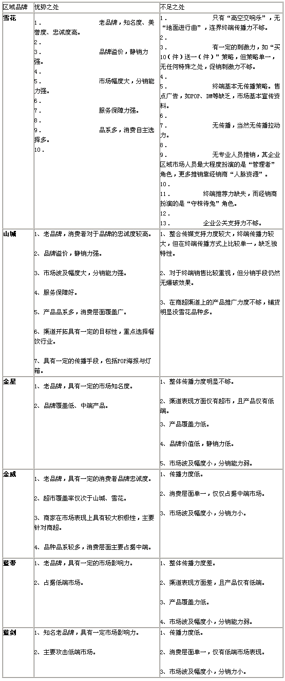 从上表可以看出,5大品牌均具有产品价值力和产品静销力,这也是品牌生存的基础。但是,区域市场的终端最终表现却各不相同,市场占有率:雪花45%,山城40%,其它15%。
