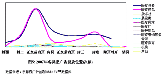 从投放位置来看,封面、封二、封三和封底由于资源有限,投放数量不多,且基本都被医疗设备以及药品广告所占据,其他位置中,医疗设备和药品投放位置最多的是正文前插页位置。此外,跨页对开这种广告形式基本只有医疗设备广告主大量使用,其他类型广告,包括药品都较少或没有。(见图5)