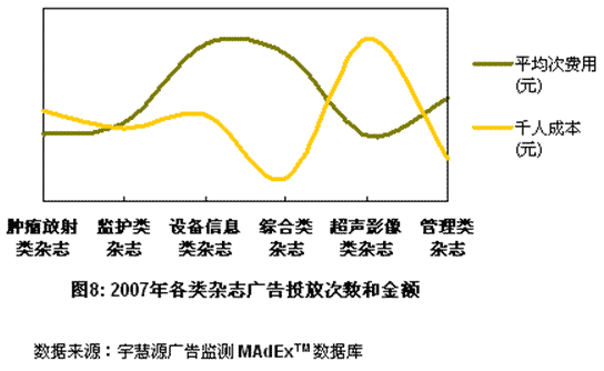 首先,专业医疗杂志是有效与大量专业受众沟通的工具。例如2007年医疗器械类产品在宇慧源监测的近百份专业杂志上的广告投入总额是3,558万元左右(根据刊例价格计算),可到达大约18,142家三级及以上医院,平均每家医院的年费用是1,961元,而每家医院有很多医师,平均到每个医师的费用则更少。