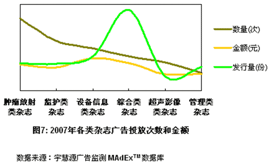 从广告投放产品来看,药品根据其功能主要投放在肿瘤放射、监护和综合类型的杂志上,设备信息类和管理类杂志少有涉及;而医疗设备广告则是在设备信息类杂志上投放最多,其次则是在超声影像类、监护类杂志上有目的有针对性的投放(见图6)。