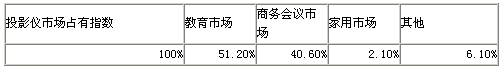 作为大屏幕终端显示设备,投影仪的市场需求分为:教育、商务会议、家用三种。其2005年中国国内不同市场的占有指数: