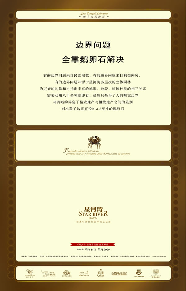 边界问题 全靠鹅卵石解决有的边界问题来自民族宗教,有的边界问题来自利益冲突,有的边界问题却源于星河湾多层次的立体园林,为更好的勾勒和衬托出丰富的地形、地貌、植被种类的相互关系,需要动用八千多吨鹅卵石,虽然只是为了人的视觉边界,却清晰的界定了精致地产与粗放地产之间的差别,别小看了这些直径2~3.5英寸的鹅卵石。