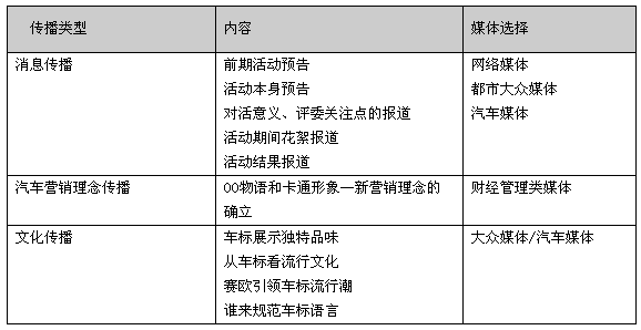 ² 以有社会影响力的都市类大众媒体、汽车专业媒体、时尚媒体媒体作为选择重点,同时配合网络进行线上、线下的全方位传播。