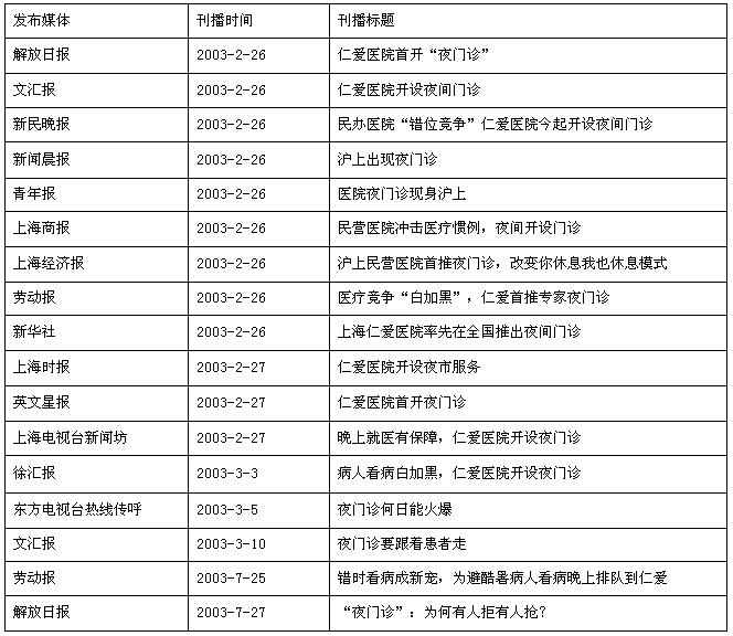 第一方面是媒体的关注程度,在仁爱医院夜门诊推出的当天,即有将近有二十家媒体进行了报道,(详见下表),形成了较广泛的媒体关注效应。随着夜门诊的逐渐延伸,到6月份天气比较炎热的季节,夜门诊又再次成为媒体关注的焦点,为百姓提供便利的医疗服务成为大家媒体所呼吁,再一次使仁爱医院成为医疗行业关注的中心,从而使仁爱医院在社会及公众心中留下良好的社会形象,这对民营而言是非常难能可贵的。
