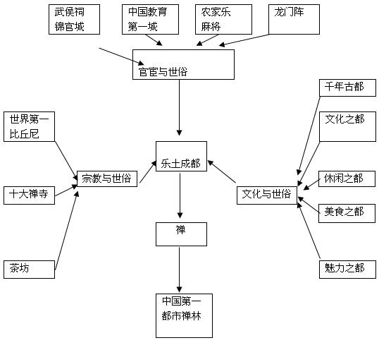 “所以用‘禅’来概括成都的城市文化可谓点晴之笔。既具有继承性,将成都平民化的文化休闲生活氛围包容,又具有国际性,在建筑、艺术、宗教上成为东方文化的代表。将本案文殊院的佛教文化引伸为禅文化,以此为定位,方能聚集起成都纷繁芜杂的文化生活资源,同时以禅文化无可比拟的包容性,整合进古今中外的文化生菜,在以成都为背景,文殊院为基点的禅文化大锅中,涮出一锅旅游文化的大餐来!”