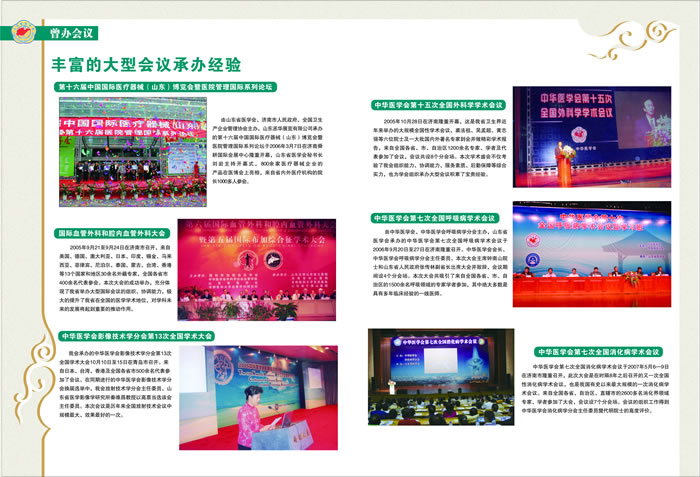 2005年10月28日在济南隆重开幕,这是我省卫生界近年来举办的大规模全国性学术会议,裘法祖、黄志强等六位院士及一大批国内外著名专家到会并做精彩学术报告,来自全国各省、市、自治区1200余名专家、学者及代表参加了会议。本次学术盛会不仅考验了我会组织能力、协调能力、服务素质、后勤保障等综合实力,也为学会组织承办大型会议积累了宝贵经验。