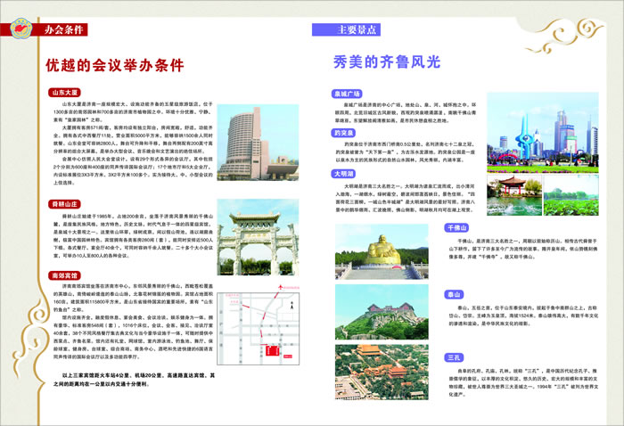 山东大厦是济南一座规模宏大、设施功能齐备的五星级旅游饭店,位于1300多亩的南郊园林和700多亩的济南市植物园之中。环境十分优雅、宁静、素有“皇家园林”之称。