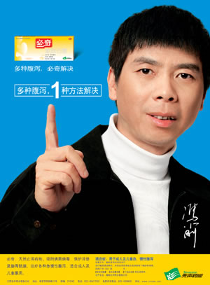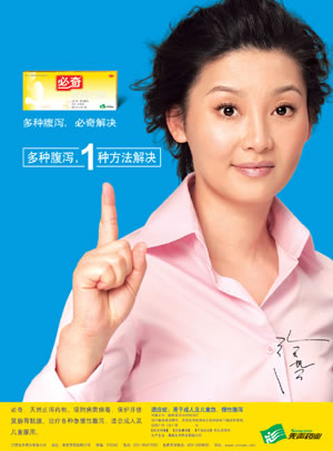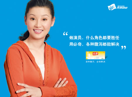 平面不能是电视广告的简单再现。出现在街头巷尾的明星,自说自话会拒人千里,只有符合身份的平实表白,唠家常一样的口气,才会让百姓觉得说得有理,才会自然关注腹泻的危害和必奇的功效。