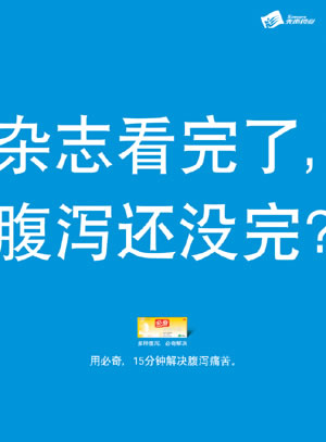 腹泻往往是突如其来、不分场合的,因此,利用各种媒体特点,可以创造出很多种趣味的广告。