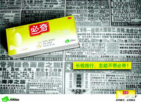 经过广泛的市场调查,了解消费者的偏好,全新设计的必奇包装,率先摈弃了药品包装的框架,大胆选用醒目的黄色为主色调,在药房里不但冲击眼球,更带来愉悦的视觉享受,和以冷色调为主的竞争品牌形成了鲜明的区隔。