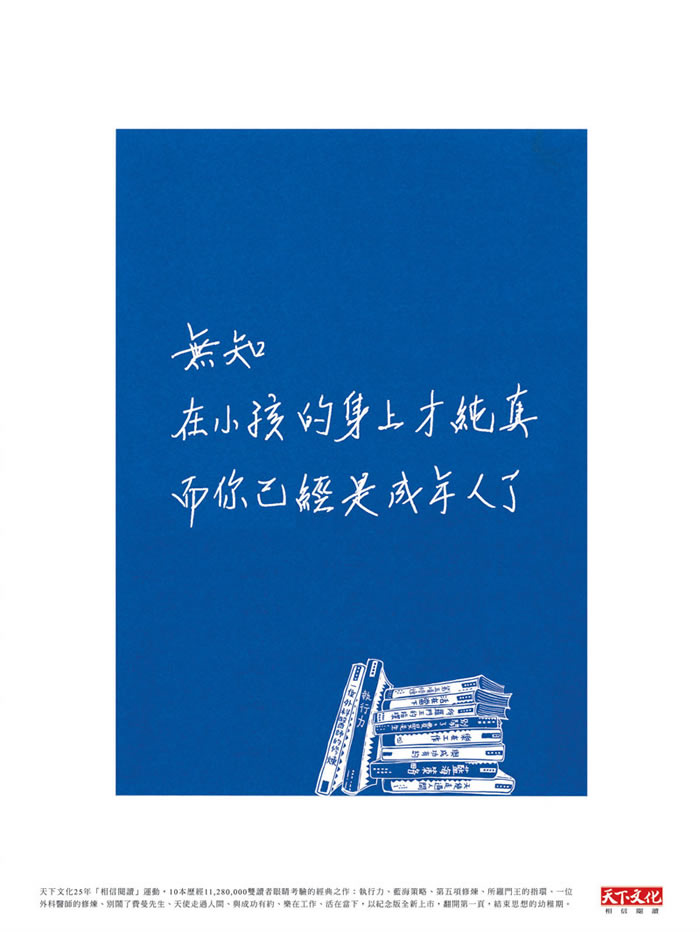 当前位置:中国广告人网站>创意策划>平面饕餮>详细内容 天下文化出版社平面广告(1) 作者:佚名 时间:2009-10-19 字体:[大] [中] [小]