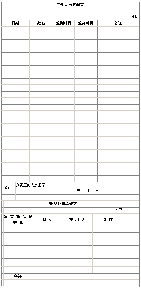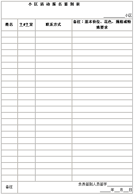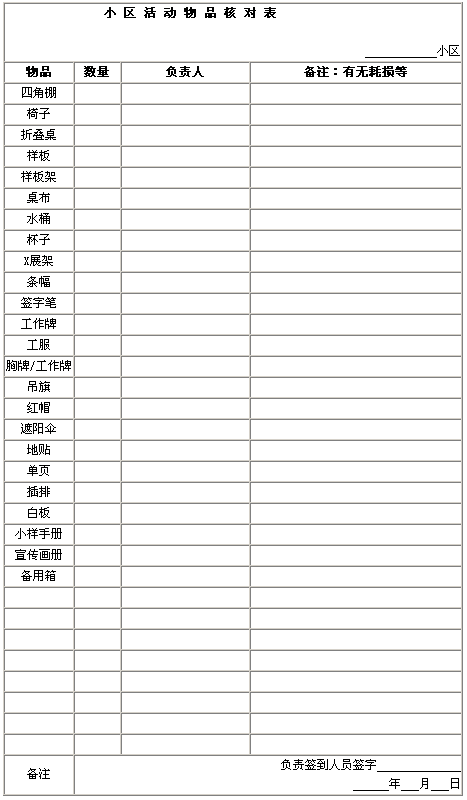 表格要有签到报名表、工作人员签到表、物品添置补损表、样板核对表;