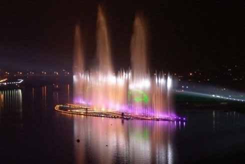 位于榕江之上的揭阳大型音乐喷泉,是目前国内最高、最长的江上音乐喷泉。该喷泉将景观工程与先进的时代文化和超前的艺术理念、浓郁的地方文化特色有机融合,表演和场景以“水上莲花”为主题,充分展示揭阳人民的美好生活,体现揭阳“水上莲花”的流光溢彩,成为榕江的一大亮点,也是揭阳市的形象标志。