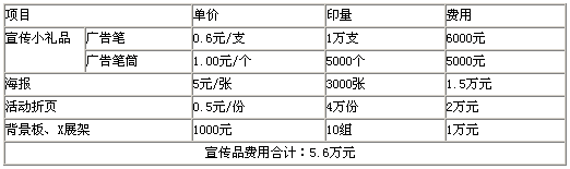 报名宣传:大学校园10个报名点,每个点场地及人员预算1000元。社会2个报名点;每个点场地及人员预算2000元。合计1.4万元