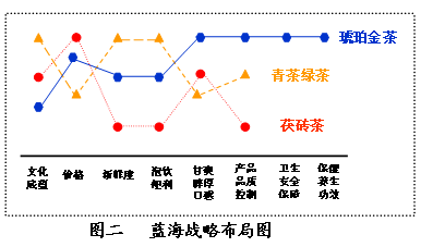 力激荡把这些要素适当合并同类项,然后提炼出来8条最关键的要素;第二步是把目标客户的另外两个可选方案(我们选了代表全发酵茶的茯砖茶作为可选方案之一;代表不发酵茶的绿茶和代表半发酵茶的青茶作为可另一可选方案)在各个要素上的得分计算出来,就能看到目标客户的哪些需求已经得到了很好的满足,哪些需求尚未得到满足;第三步就是明确琥珀•金茶的差异化定位,在哪些要素方面与现有的可选方案旗鼓相当,在哪些方面可以与众不同,给客户提供前所未有的体验,体现独到的价值,于是我们发现了两个要素:卫生安全保障和保健养生功效(见图二)。