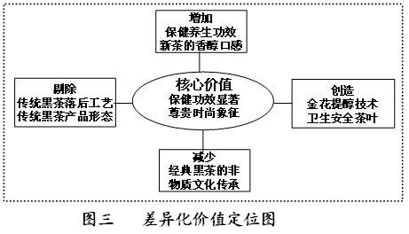 基础,这些都是琥珀•金茶独到的价值,是目标客户在其它产品上找不到的价值;其次,明确琥珀•金茶在哪几个方面要强化,即比现有的两种可选方案要强,在这里我们选择了新茶的香醇口感优于5年藏陈茶,保健养生功效是其他产品所不具有的;第三,在哪些方面我们要弱化,即减少对传统茶文化的依赖;第四,在哪些方面可以删除,干脆就不要了,以降低成本,改善客户体验,我们选择了现代制茶技术和工艺,不采用传统的产品形态,既保证了食品卫生,又提高了产品品质稳定性和产量。(见图三)