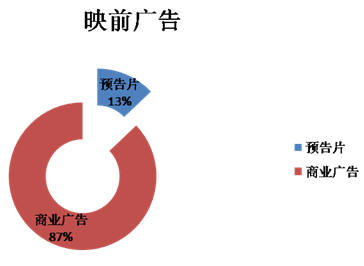 根据统计数据显示,《建国大业》放映当期内平均每个影院播放的映前广告为65.3条,映前广告最多的影院为广州天河影城,播放的映前广告为153条。其中预告片占13%,商业广告87%。