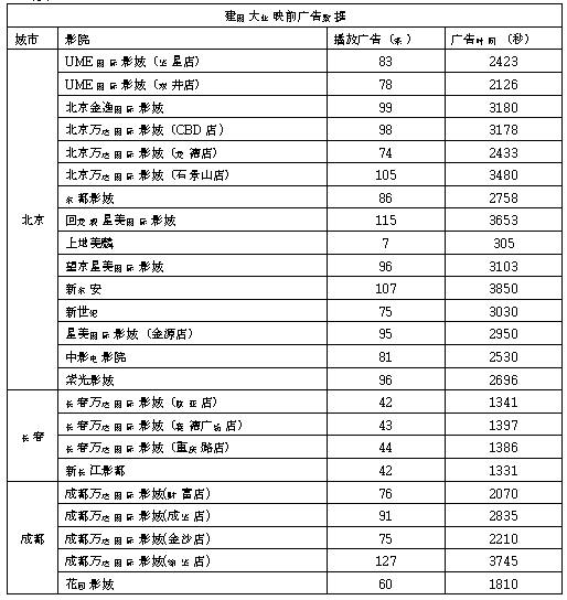 本次监测针对全国22个城市107家影院进行《建国大业》映前广告监播,共监测到建国大业映前广告6987条。其中北京,上海与成都的映前广告最多,分别达到了1295条,1207条与803条,占到总体映前广告的57%。