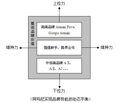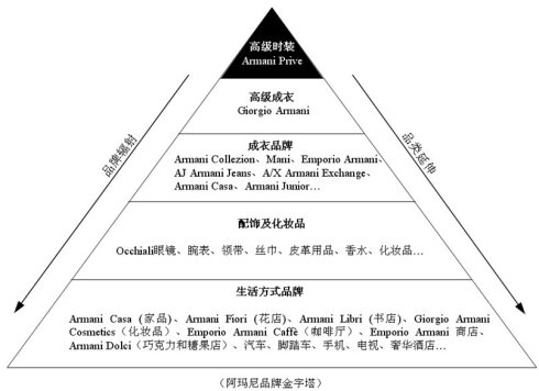 塔,才能使品牌丰满有力。在阿玛尼品牌系列中,从二三十万人民币一套的高级订制时装Armani Prive系列,到一套西装三万人民币左右的Giorgio Armani,再到数百元的阿玛尼低价品牌系列,产品定位由高到低排列了十几个定位不同的副品牌。这些品牌有各自明确清晰的品牌定位,以便顾客区分。并采取了不同的渠道种类以防品牌间相互冲突。另一方面,品牌间又保持着某种联系。无论是Giorgio Armani的高端奢侈、Armani Collezini的端庄淡雅、 A/X的年轻时尚,还是Armani Jeans的大众休闲,它们又同时奇妙地保有了“阿玛尼品牌”的特有设计精髓。阿玛尼除进行品牌延伸之外,经营品类也进行了的广泛延伸,从各种服饰及配套产品一直延伸到各种生活用品,直至进入食品、汽车、酒店业。阿玛尼现在已经从一个单纯的时装品牌成功地转型为一个完整的时尚奢侈生活方式品牌。只要消费者喜欢,他们一天24小时都能接触到阿玛尼的产品和服务。