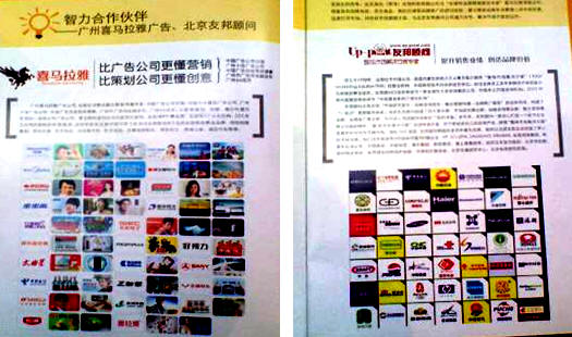 目录中提到的智力合作伙伴,在第五页至第八页做了大篇幅的显摆:案例、忽悠业绩、还有所谓的某种理论......,而让我一直齿寒的是那句经典的广告语:×××广告公司,比“广告公司更懂营销、比策划公司更懂创意”,这句仿佛已经家喻户晓的妙语,这么多年来都让我想起来就会发笑。赵先生很厉害,他会用自己肥硕强壮的身体和兵乓球冠军邓亚萍打拳击,而且要用自己并不怎高明的乒乓球三脚猫功夫与篮球大师姚明对抗一场兵乓球比赛......果然是个超级聪明的人!哈哈