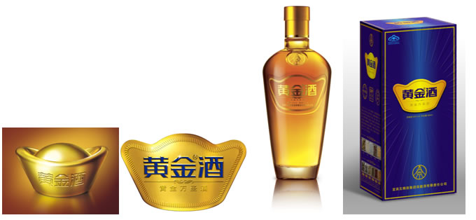 以金元宝为设计元素设计酒标,以蓝色和黄色的对比突出品牌。