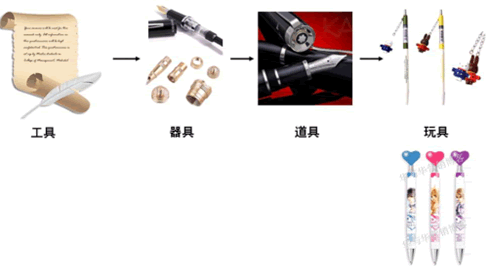 什么叫书写工具呢?当马克思拿一根鹅毛蘸墨水写《资本论》的时候,他手里拿的才是一个原始的“书写工具”。“工具”是石器时代的词汇,有陶罐的时候就不是工具了,是器具,有一定技术含量的。所以当钢笔和圆珠笔出现的时候,就是“书写器具”了.
