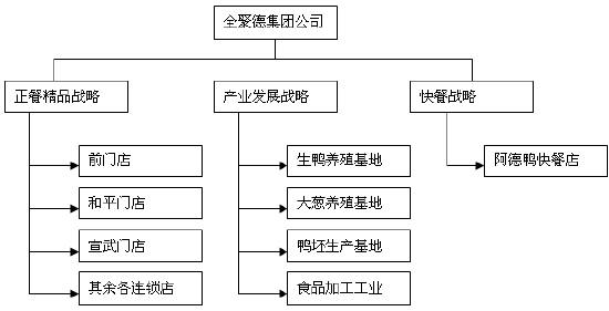 笔者在考察调研全聚德品牌战略时,获悉其发展目标是:以全聚德烤鸭为龙头、以精品餐饮为基业,通过有效的资本运营,积极审慎地向相关产业领域延伸,创造具有中国文化底蕴、实力雄厚、品质超凡、市场表现卓越、享誉全球的餐饮业世界级品牌。全聚德品牌的主要物质载体是全聚德烤鸭正餐,充分挖掘它的特色和优势,强化社会认知度,继续发展正餐全聚德烤鸭店,在北京、全国以至国际上仍有较大的发展空间和市场潜力。全聚德独有的个性和魅力,是其它后起之秀所不及的。但是,单一的全聚德烤鸭正餐,对于一个追求世界级品牌的企业来讲,其事业领域显得过于窄小,因此必须谋求品牌的合理延伸和产品多元化。即全聚德应该选择全面的事业品牌发展战略一一“正餐精品品牌战略”、“快餐品牌战略”和“食品加工业品牌战略布局。