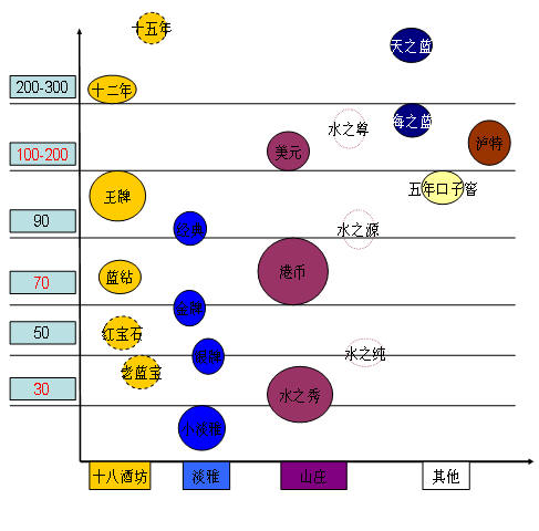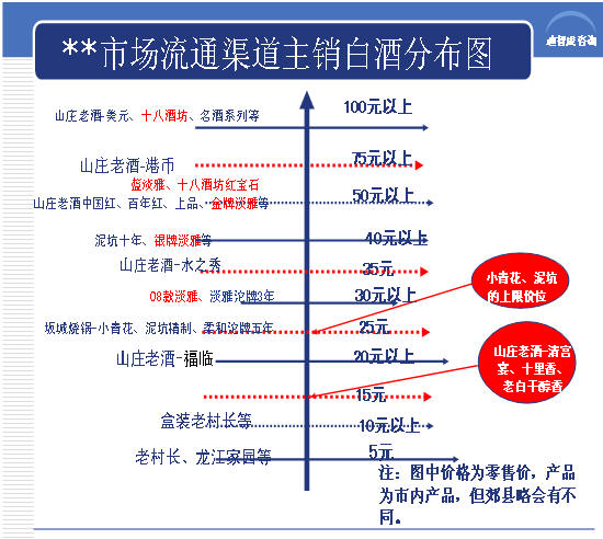 通过大量的走访终端、分销客户和部分消费者以及该市场的白酒业务代表,获取了第一手的产品分布和价格构成资料,然后根据得到的产品价格信息,按照价格由低到高纵向按轴线绘出该市场的产品结构图,根据该图,市场竞争产品及其市场地位一目了然。