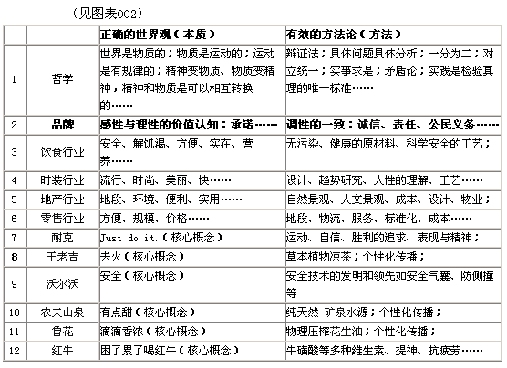 说到此,各行各业道理都是相通的和隔行不隔理,品牌经营不也同李小龙的截拳道“以最短的路径、最快的速度、最有效的方法将对手击倒”的理念一样吗?不过对于品牌经营来说所要“击倒”不仅仅是“竞争品牌”(当然也包含双赢),更重要的是要“击到”目标消费者的心智里去,达到“一箭穿心、一见倾心、刻骨铭心”,使他们记住我们、喜欢我们、离不开我们“相伴到永远”。那么,如何才能做到或者说什么才是获得消费者心智“最短的路径、最快的速度和最有效的方法”呢?这就要研究特定行业和品牌的本质、以及目标消费群的本质是什么?(见图表002)