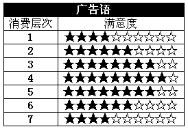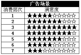 综合以上分析来看,各消费层次消费者对此广告场景的满意程度如下表所示: