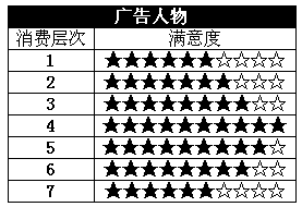 综合以上人物的各个要素来看,各消费层次消费者对此广告人物的满意程度评价如下: