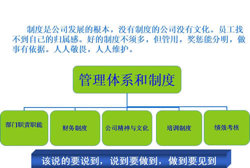 制度是公司发展的根本,没有制度的公司没有文化。员工找不到自己的归属感。好的制度不须多,但管用,奖惩能分明,做事有依据。人人敬畏,人人维护。