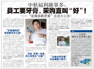 中秋和十一期间,以“云南白药牙膏成节日送礼送健康的首选”为新闻点进行节日产品热销炒作。诸如报纸软文:《中秋:送礼年年变,今年变牙膏》、《今年中秋发“牙膏”?——一支20多元高档牙膏成公司福利“新热门”》,《中秋福利趣事多:员工要牙膏,采购直叫好!》、《为25岁以上有口腔问题的人算笔帐》、《口腔问题,它们可曾让你丢了饭碗?》。