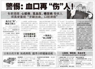 分别刊发了《血!血!血!——高血压、糖尿病、心脏病、胃病、慢性消化道疾病这5类病人:警惕口腔红色危机》、《心脏病、高血压、糖尿病、胃病、慢性消化道疾病这5种人,牙龈出血、口腔溃疡更危险!》、《口中三患祸全身:血患、痛患、疮患!》、《牙龈出血、口腔溃疡、牙龈肿痛:3类人“不得不防”!》等文章。