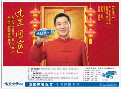 打破了常规日化产品的传统思维,打出了送份“口腔健康”的市场号召——牙膏也可以送礼,在中国商家纷纷眼红下注的节庆市场,云南白药牙膏顺利地抢到了一杯羹。诸如:《高档牙膏遭抢购 买来多半当礼送》。