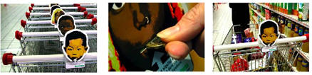 这是西班牙马德里Zapping公司创作的提倡募捐的广告。在这些超市手推车上镶嵌着三块不同肤色的儿童画板:黄种人、印第安人和黑人。这些儿童都非常消瘦。而每个画板下面有一个指示牌,上面有这样一句话:“用你租这辆车的押金(一枚硬币)就可以喂养他两天。”指示的地方是孩子的嘴部,同时也是一个投币孔。